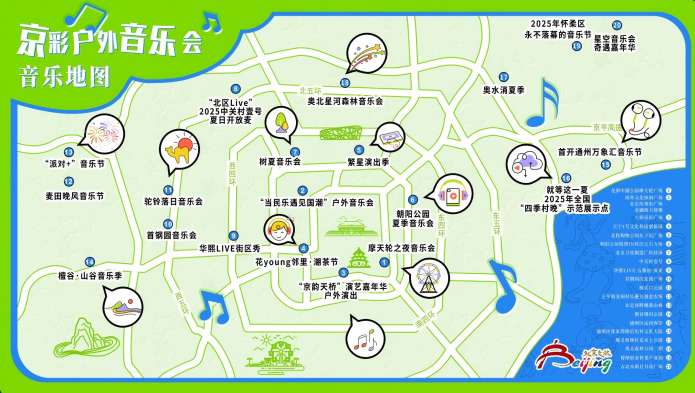 9월부터 12월까지 베이징에서는 공원, 상권, 산업단지, 강변, 관광지, 호텔 및 민박 등 다양한 공간에서 야외 음악회 프로그램 약 120개를 약 2000회 개최할 예정이다. 동시에 이색 장터, 미식, 캠핑 등 다양한 부대 행사도 함께 마련하여 다채로운 체험 시나리오를 조성한다.