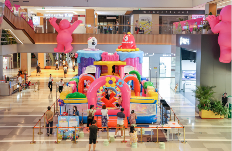 쇼핑몰의 야외 구역에서, 가족들이 각양각색의 상품으로 가득한 특색 판매대를 둘러보고 있다.