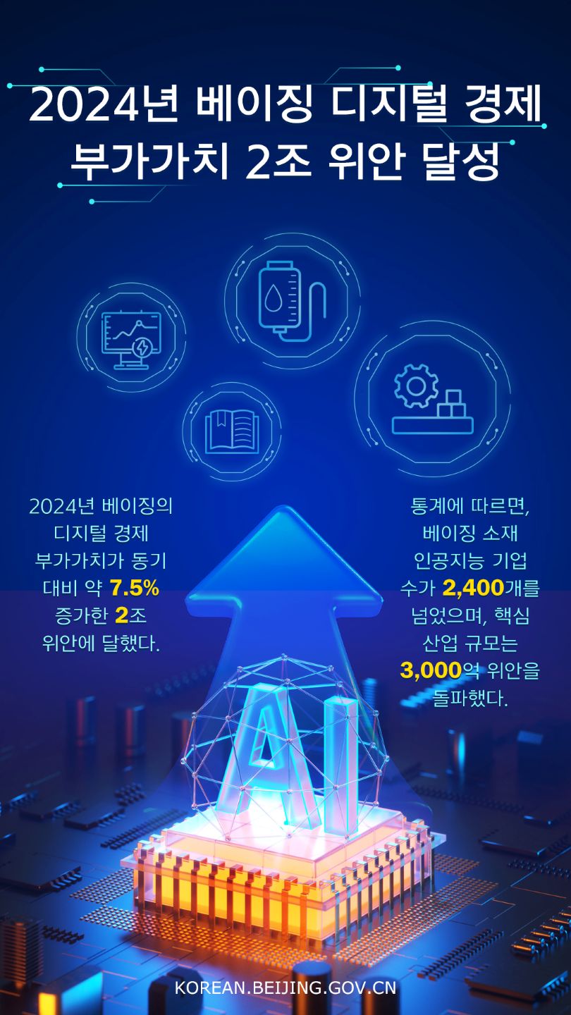 2024년 베이징의 디지털 경제 부가가치가 동기 대비 약 7.5% 증가한 2조 위안에 달했다.