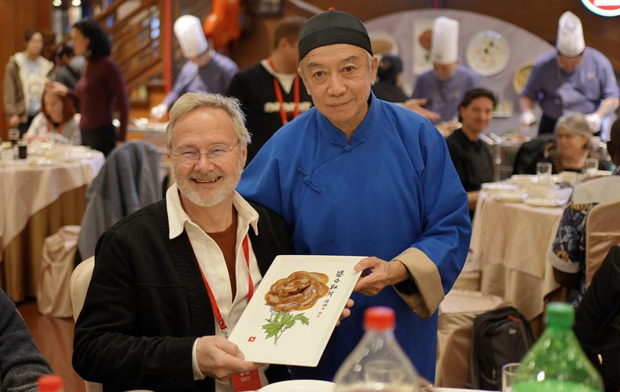 베이징 첸먼(前门)거리에 위치한 취안쥐더(全聚德) 본점에서 외국인 관광객이 중국 전통 의상을 입은 종업원과 기념 사진을 찍고 있다. (사진/신화통신)