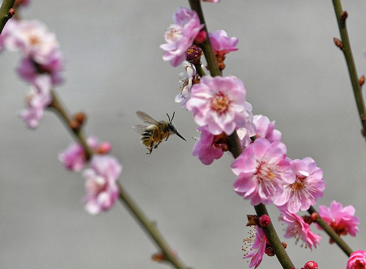 매화꽃에서 꿀을 채취하는 꿀벌 [사진 출처: 신징바오]