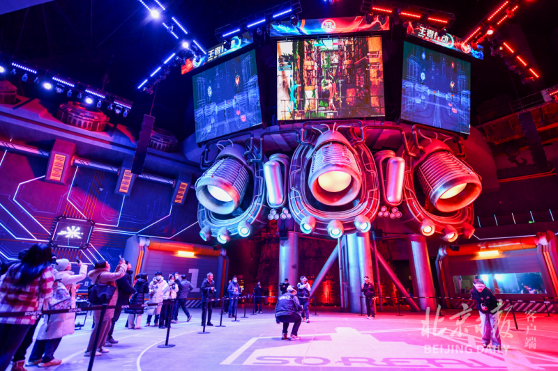 서우강 1호 용광로·SoReal공상과학랜드(首钢一高炉·SoReal科幻乐园)에서 징진지 세 지역의 기자들이 공업 유적과 첨단 공상과학의 융합을 체험하고 있다.