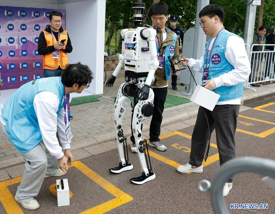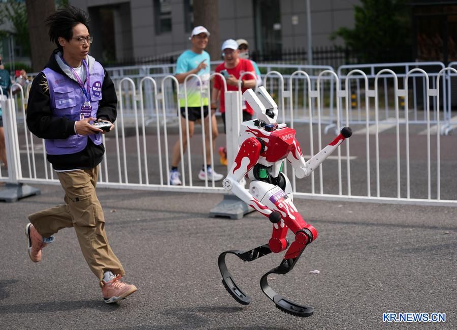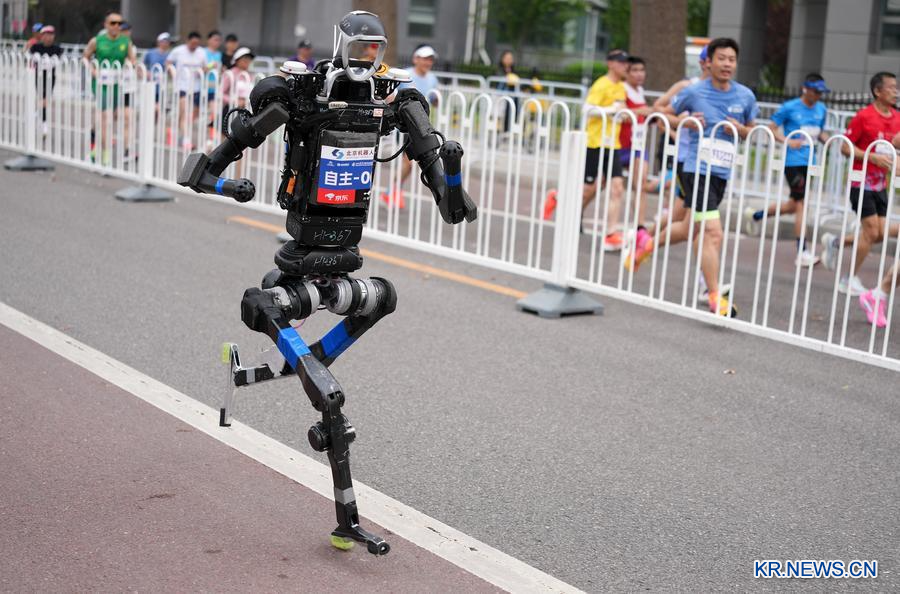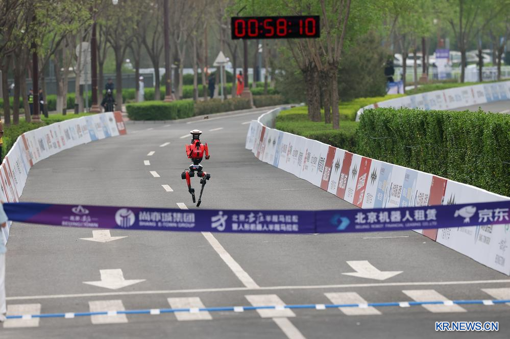 19일 치텐다성(齐天大圣)팀의 자율형 휴머노이드 로봇 선수 산뎬(闪电)이 결승선을 향해 달려오고 있다. [사진: 신화통신]