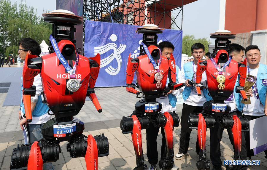 19일 휴머노이드 로봇 하프마라톤 대회에서 우승을 차지한 치텐다성팀의 산뎬(앞줄 오른쪽), 2위의 레이팅(雷霆)산뎬팀의 산뎬(앞줄 왼쪽), 3위의 싱훠랴오위안(星火燎原)팀의 산뎬(앞줄 가운데)이 시상식을 마치고 함께 기념 촬영을 하고 있다. [사진: 신화통신]