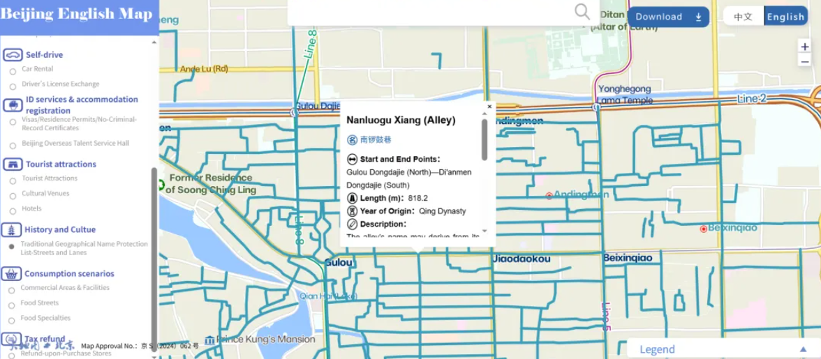 신규 지도는 정보 내용이 한층 더 풍부해져 출국 세금 환급 절차, 운전면허 교체 및 렌터카 서비스 지점 연락처, 호텔 등급 정보, 공원 및 관광지 개방 시간 등을 포함한다. 또한 역사문화적 특색도 더욱 부각되어 베이징의 세계문화유산, 주요 역사문화 랜드마크, 전통 거리와 후퉁(胡同), 라오쯔하오(老字号·중국 전통 브랜드) 등 역사문화 정보를 중점적으로 보여준다.