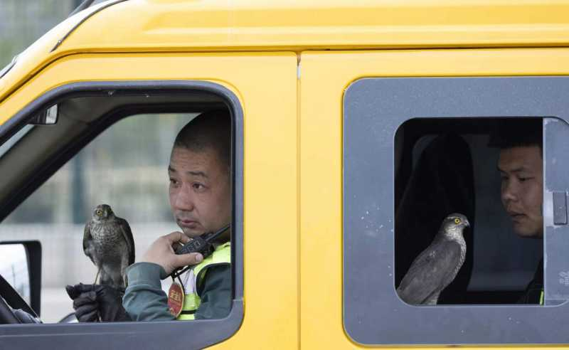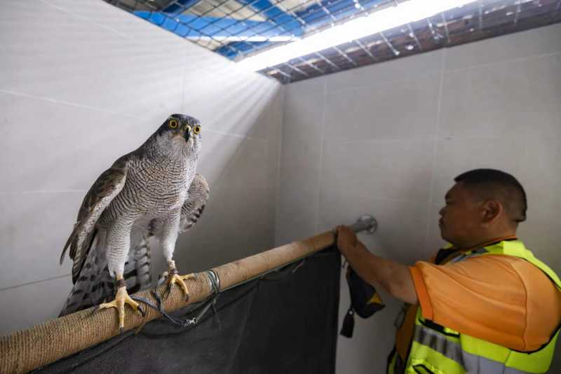 통제 가능한 범위 내에서 '줄밥부르기'를 이용해 참매로 새를 쫓는 직원