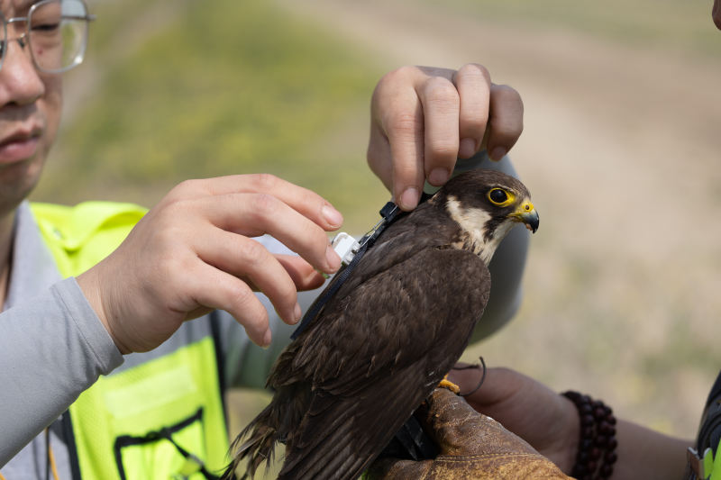 안전 구역 내에서 비행할 수 있도록 새호리기에게 GPS를 달아주는 직원
