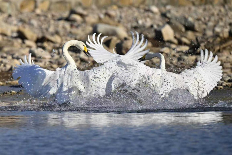 최근 여러 무리의 백조들이 저수지 해변에서 미윈 칭수이허(清水河) 타이스툰(太师屯) 루거좡(芦各庄) 유역으로 날아와 백조, 고니, 혹고니가 한 연못에서 무리를 지어 겨울을 나는 모습을 형성했다.