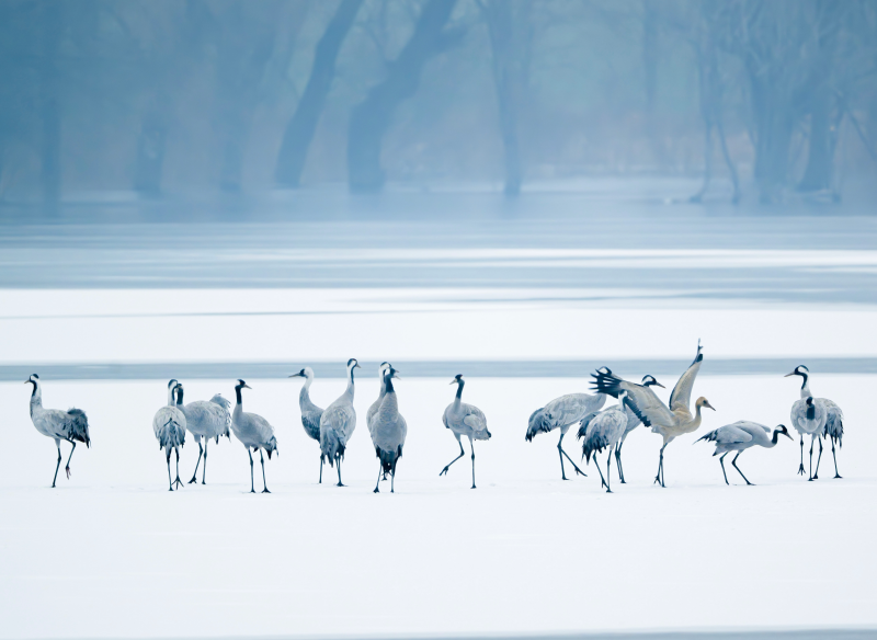 최근 베이징시 순이구(顺义区) 탕즈산(唐指山)의 눈덮힌 저수지 빙판에 국가 2급 보호동물 검은목두루미 16마리가 발견되었다. 검은목두루미의 늘씬한 자태와 빙설이 어우러져 아름다운 풍경을 만들어냈다.