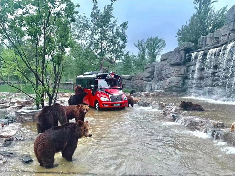 다양한 형태의 사파리 투어를 제공하는 동물원은 자가운전 관광 구역, 맹수 체험 구역, 도보 관광 구역 등 세 군데로 나눠져 있다. 자가운전 관광 구역은 총 7개의 동물 전시 구역으로 나뉘며, 자가운전 관광과 꼬마 열차 관광 두 가지 관람 방식이 제공된다. 맹수 체험 구역은 8개의 전시 구역으로 구성되며, 다양한 맹수가 살던 곳과 비슷한 서식 환경과 문화 분위기를 조성하는 동시에, 관광객이 근접 거리에서 맹수를 관찰할 수 있도록 세심하게 설계한 관람차를 마련했다. 도보 관광 구역에는 어린이를 위한 '기묘한 놀이공원(奇趣乐园)', 사진 찍기 좋은 핫플 '블루 타운(蓝色小镇)', 중국식 동물 인터랙티브 구역 '사슴동산(鹿园)' 등 다양한 체험형 전시 구역이 마련되어 있다.