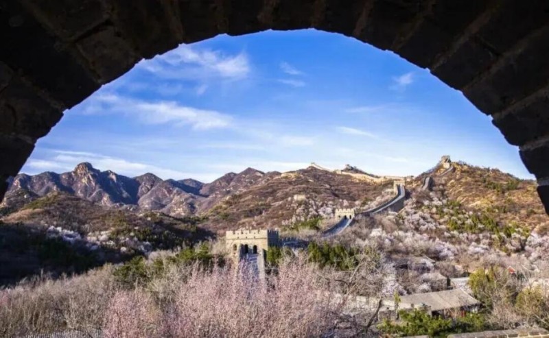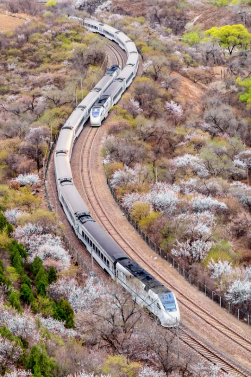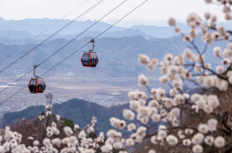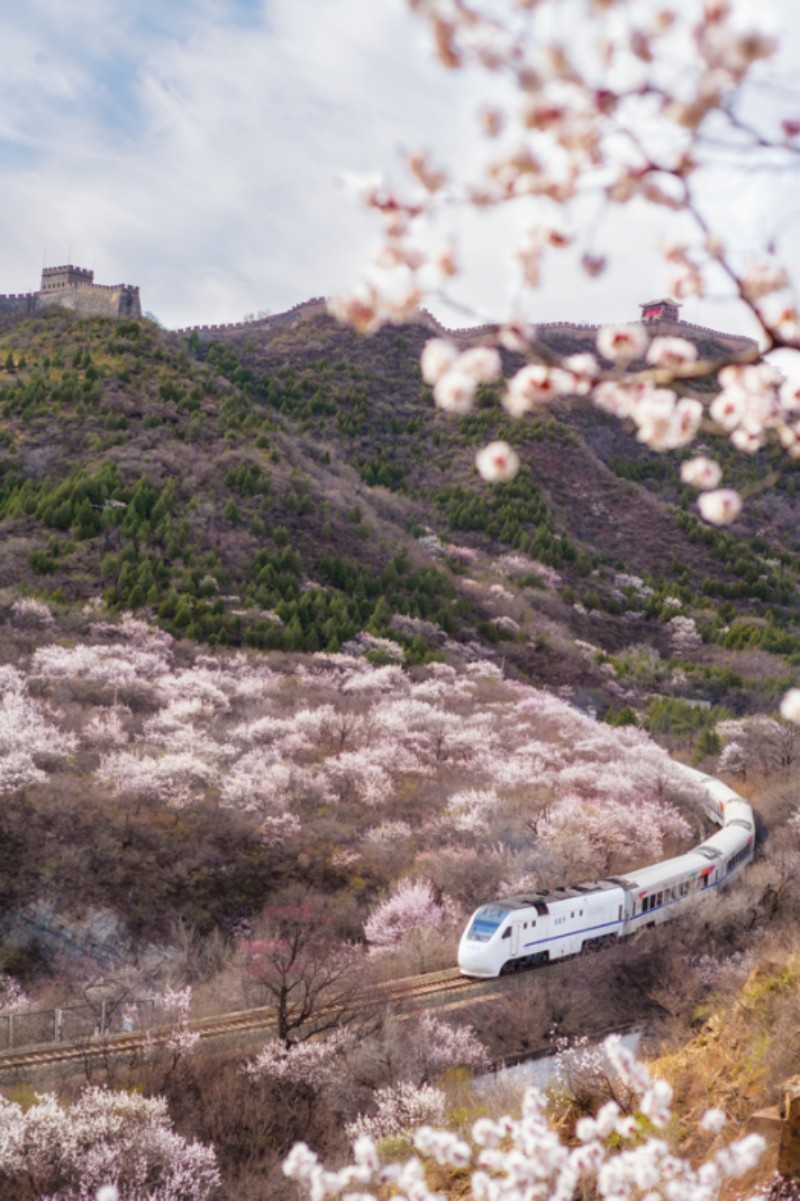 최근 쥐융관 꽃바다 잔도가 예정대로 개방되었다. 개복숭아꽃과 살구꽃이 만개해 온 산을 뒤덮었으며, 교외 철도 S2선이 꽃바다와 장성 사이를 가로지르며 '봄으로 달리는 열차' 절경을 그려낸다.
