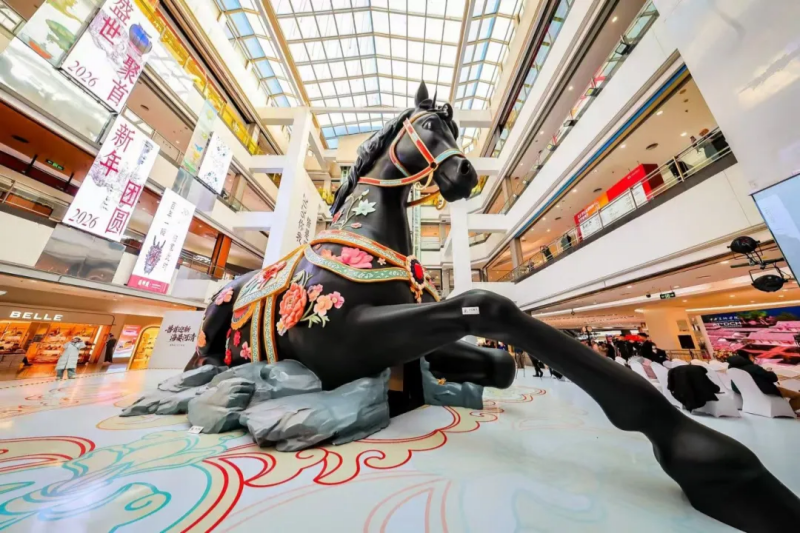 전시에서 총 길이 16m에 달하는 대형 설치 미술 작품 '거마(巨马)'가 관람객의 시선을 사로잡았다. '거마'는 3층 높이로, 디자인은 위안밍위안 소장 문물인 말머리 동상에서 영감을 받았으며, 청나라 궁정 회화작품 <건륭대열도(乾隆大阅图)>의 용맹한 기운을 융합했다. 이 설치 미술 작품은 2026년 말의 해에 대한 예술적 표현이다.